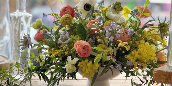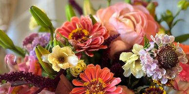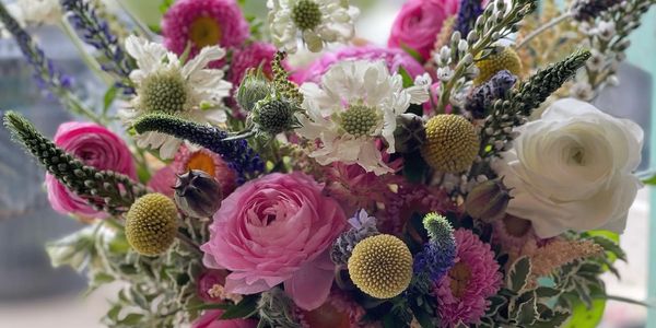a mix of seasonal blooms- 10 stems with greenery and seasonal filler such as waxflower or statice or limonium