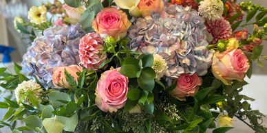 a beautiful mix of seasonal flowers to include hydrangea roses ranunculus and more in a 5/5 glass cube or cylinder